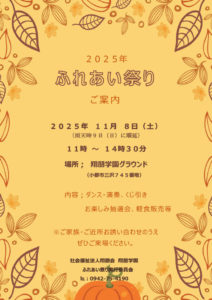 社会福祉法人翔朋会からのお知らせ 2023 12/28 女性入所希望者 2名空いています!→1名入所されました。翔朋学園 女性入所者 2名空きあり施設見学等、お気軽にお問い合わせください。 お知らせ 関連記事 2025年ふれあい祭りのご案内 2025年9月5日